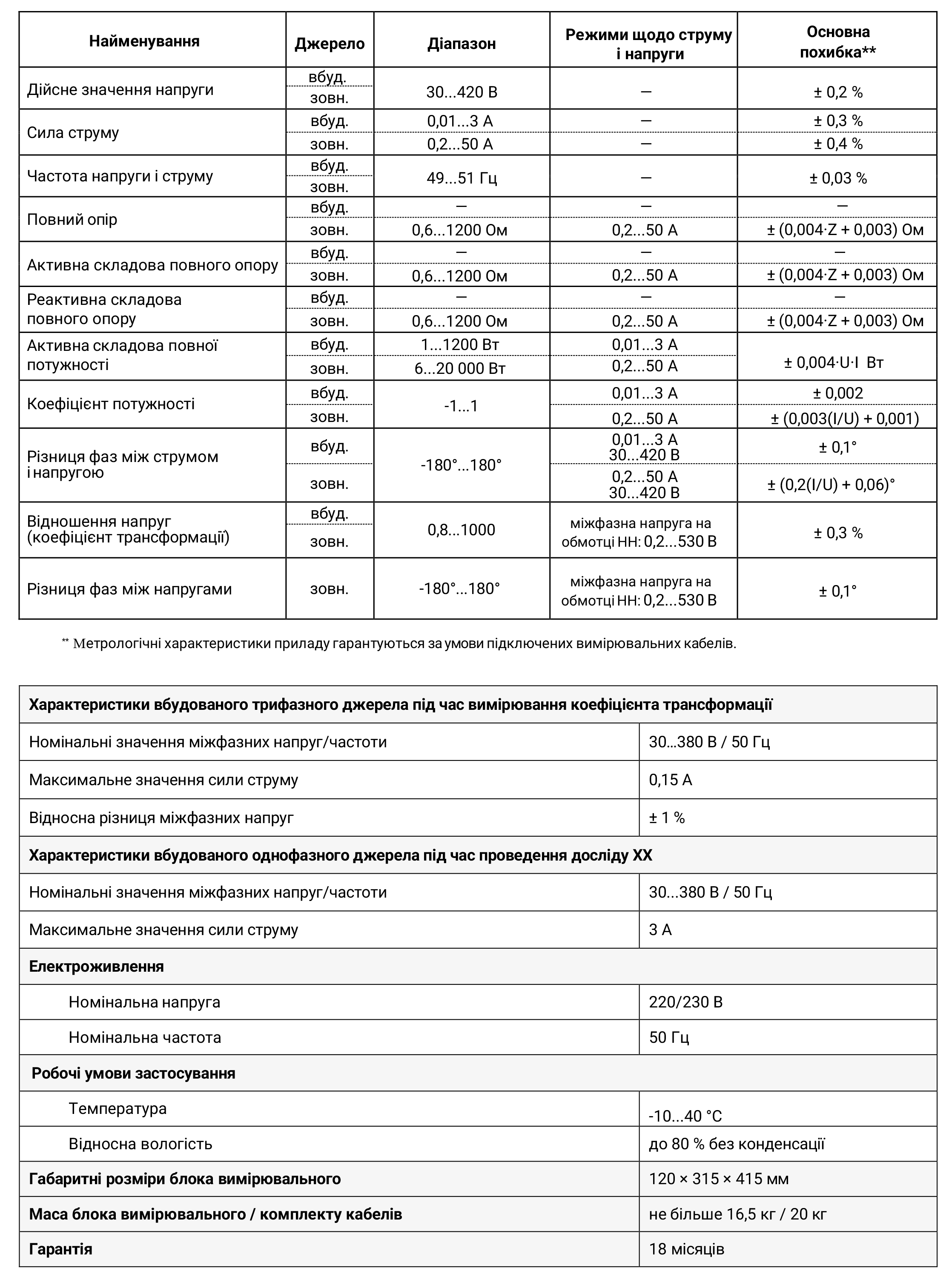 - Довжина вимірювальних кабелів 25 м.