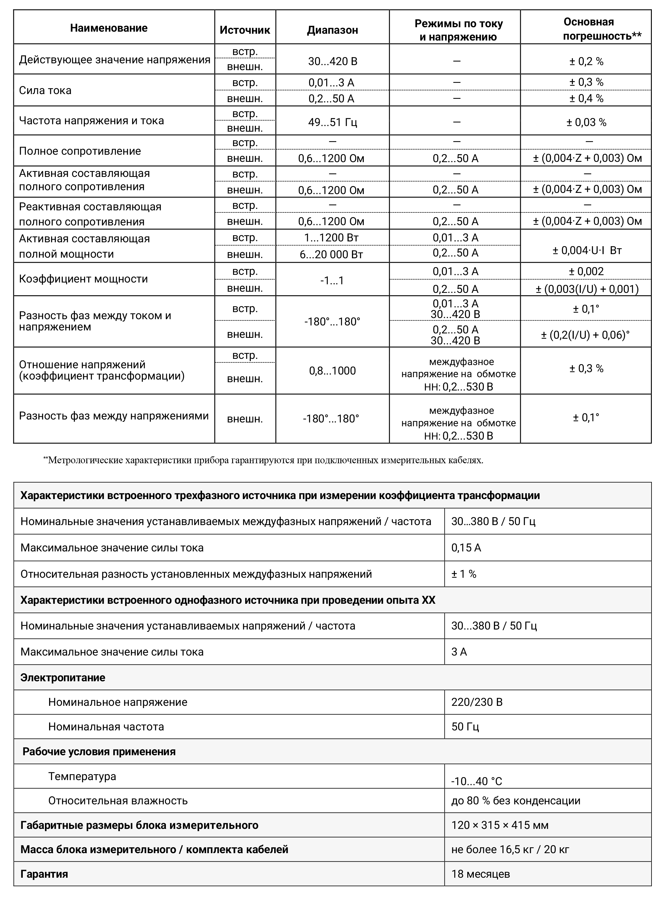 | Характеристики встроенного трехфазного источника при измерении коэффициента трансформации | |