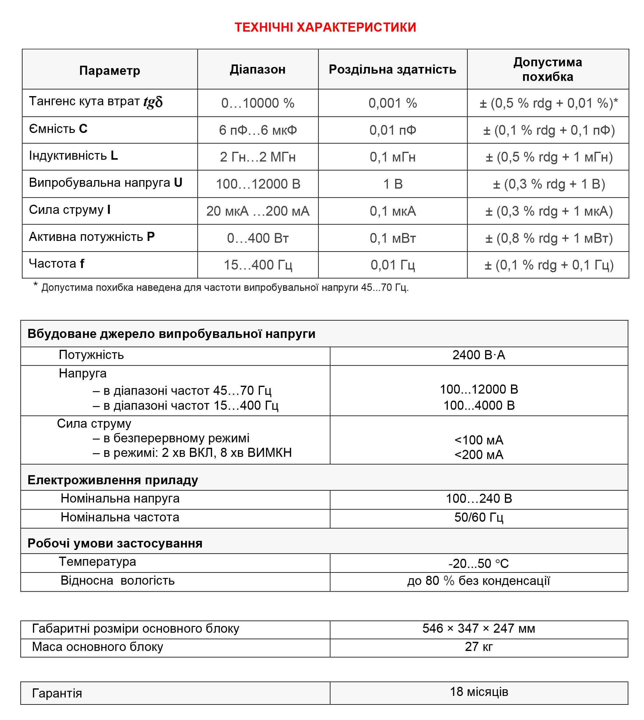 - Частота випробувальної напруги – 15…400 Гц.